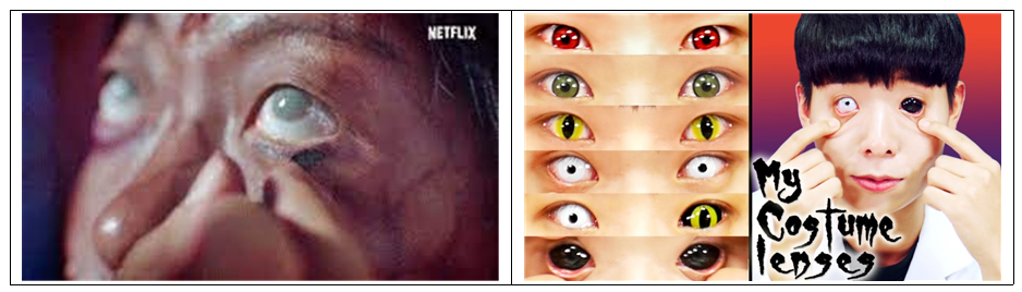 눈빛이 붉게 변하거나, 눈에 효과가 들어가는 경우 렌즈를 끼고 찍는 경우도 많다.