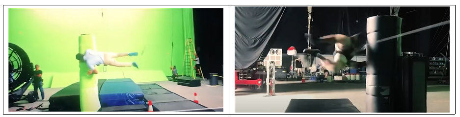 | 실제 배우 = 안전메트 촬영 | 대역 스턴트 = 안전 장비 착용 촬영 |