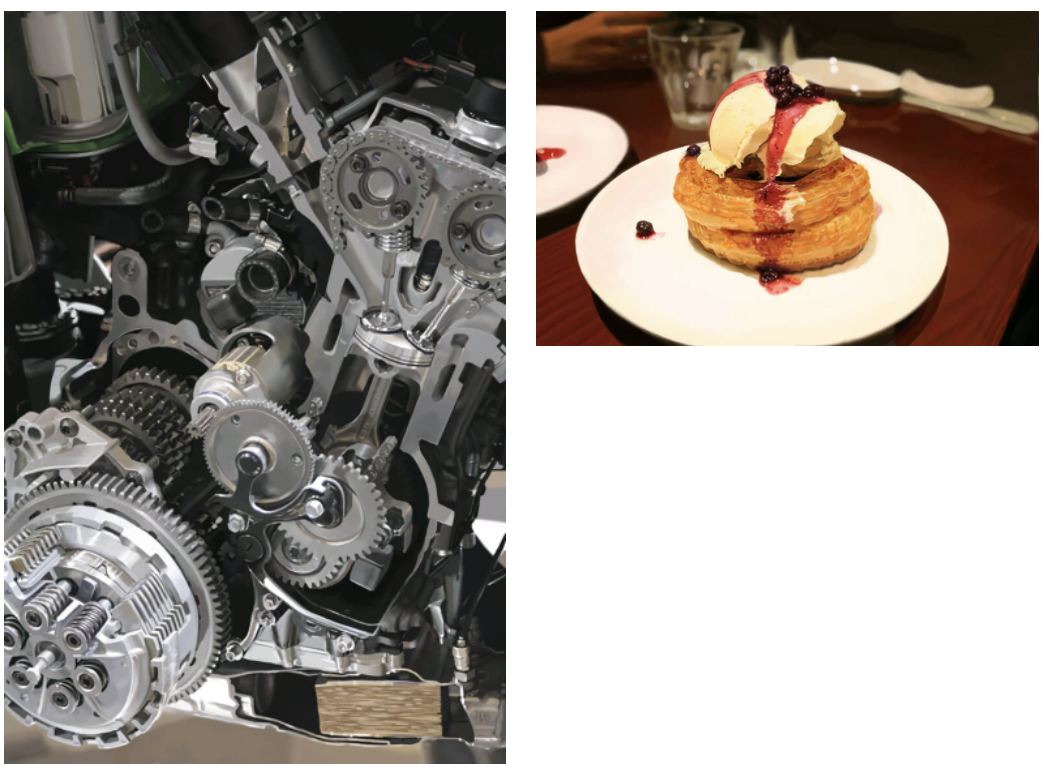 ▲토야마씨가 연습을 위해 그렸다는 사진의 모사. 【오른쪽】은 3일 만에 그렸다고 한다. 「앞의 케이크는 비교적 그려져 있습니다만, 안쪽은 대담하게 흐리게 하고 있습니다. 그래도 인간의 눈은 포토 리얼이라고 느껴 버린다. 그런 것도, 그려 가는 가운데서 알고 있습니다」